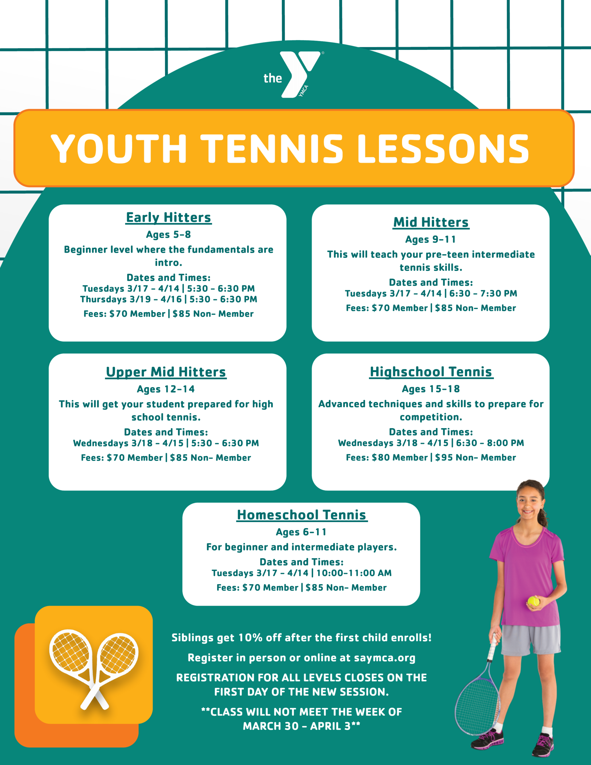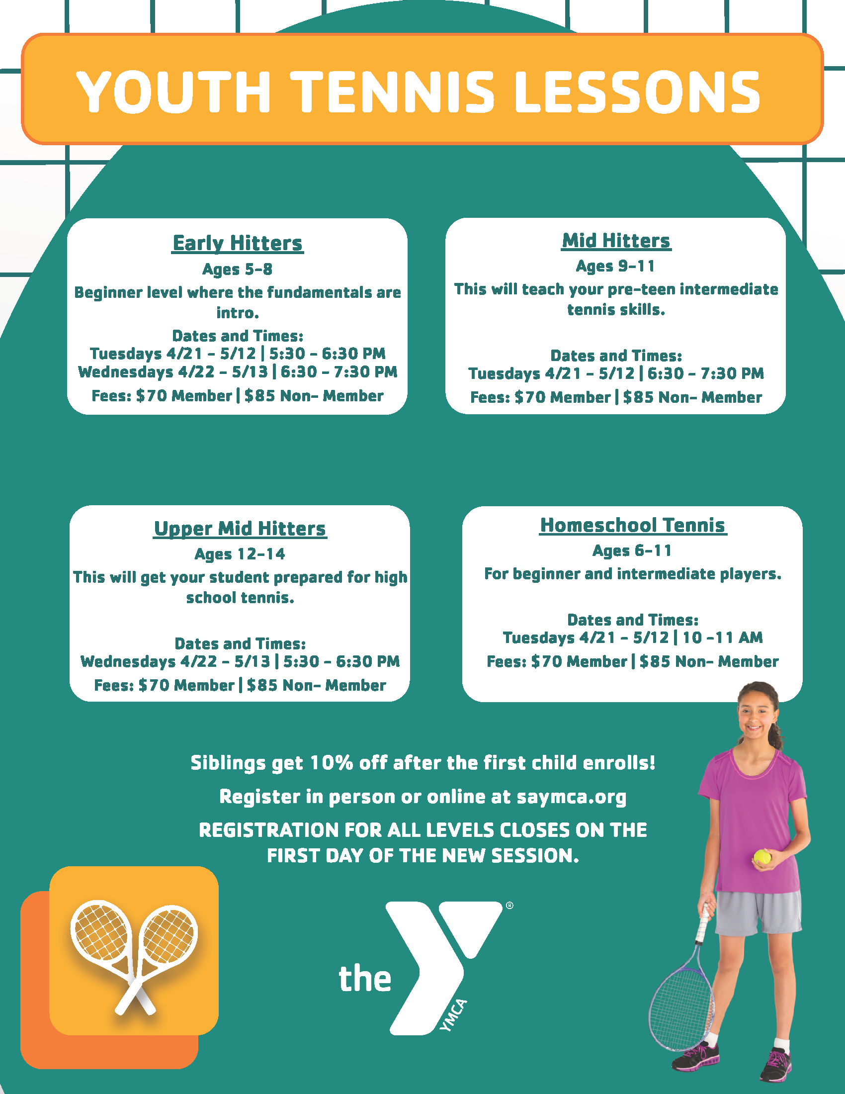 Siblings receive 10% off! Discounts cannot be applied when registering online. If you may be eligible for a discount please register in person at the front desk.